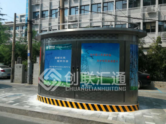 箱體外殼由材料層、龍骨與防護鋼板層三層組成,可以較好地對變電站內的用電設備進行較好地保護;箱體外殼為橢圓柱狀,結構更加緊密牢固。箱體外殼的前表面設置有雙開門,箱體外殼的表面均勻地設置有電纜線孔且所述電纜線孔內貫穿有電纜線。與周圍的環境相適應,同時也提高了變電站的通風散熱的效率。