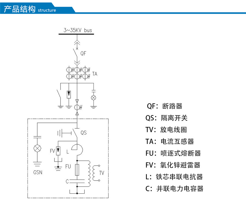 型高壓無功集中補償裝置,是將固定容量的電容器組  并聯連接在配電變壓器3~35kV母線上,提供固定容量的容性無功功率,補償感性無功功率,改善功率因數,穩定系統電壓,從而降低線路損耗,提高變壓器傳輸容量,提高整體的電力傳輸效率。裝置由并聯電容器、串聯電抗器、放電線圈、避雷器、控制和保護裝置等組成。主要應用于3~35kV負荷波動不大的交流電力系統中