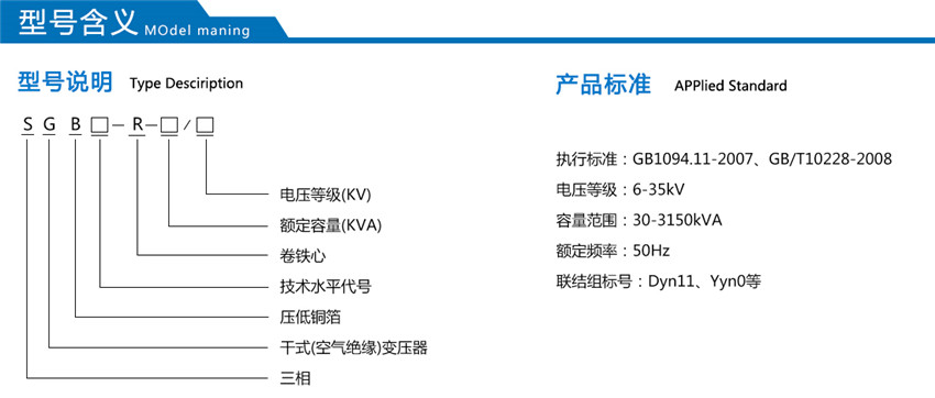產品型式為H級、戶內、三相、雙繞組、非包封型(SGB)節能型干式變壓器