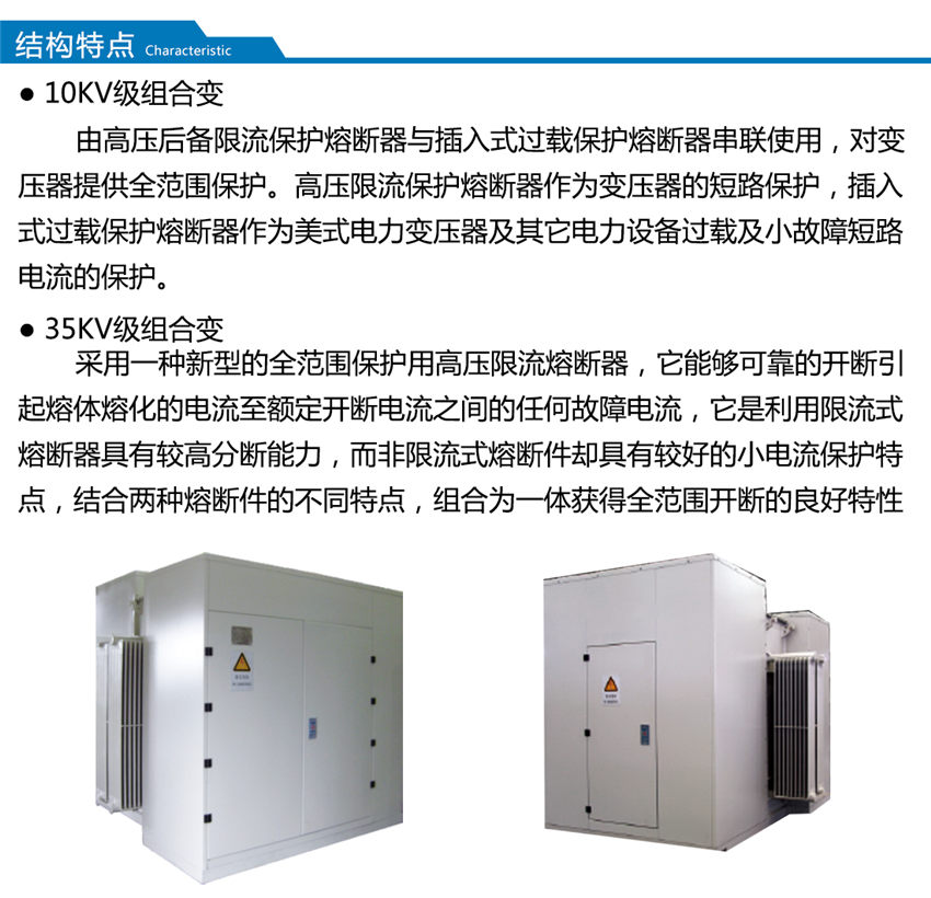 ZGS-Z.T-□/□系列組合式變壓器是消化吸收內外的先進技術結合內需求自行開發(fā)的系列產品,該產品是將變壓器,負荷開關,高壓熔斷器安裝在變壓器的箱體內,利用變壓器的絕緣液體作為整個產品的絕緣和散熱介質,采用全密封結構,外殼采用分體,噴丸、酸洗、磷化、分別噴涂底漆、中間漆、面漆達到表面的防腐性、耐厚性、防紫外線性均超過普通噴涂的強度,具有體積小,重量輕、安裝方便等優(yōu)點。