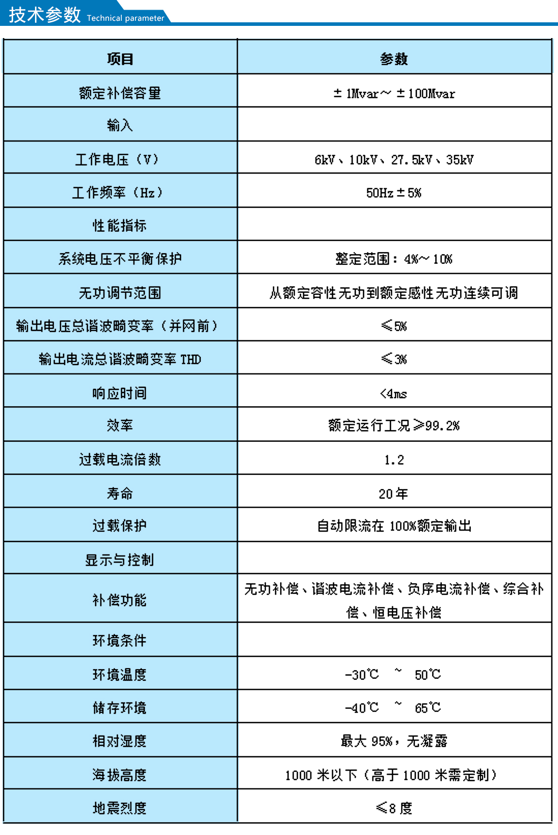 【額定補(bǔ)償容量】:±1Mvar~±100Mvar      【工作電壓】:6kv 、10kv、27.5kv、35kv